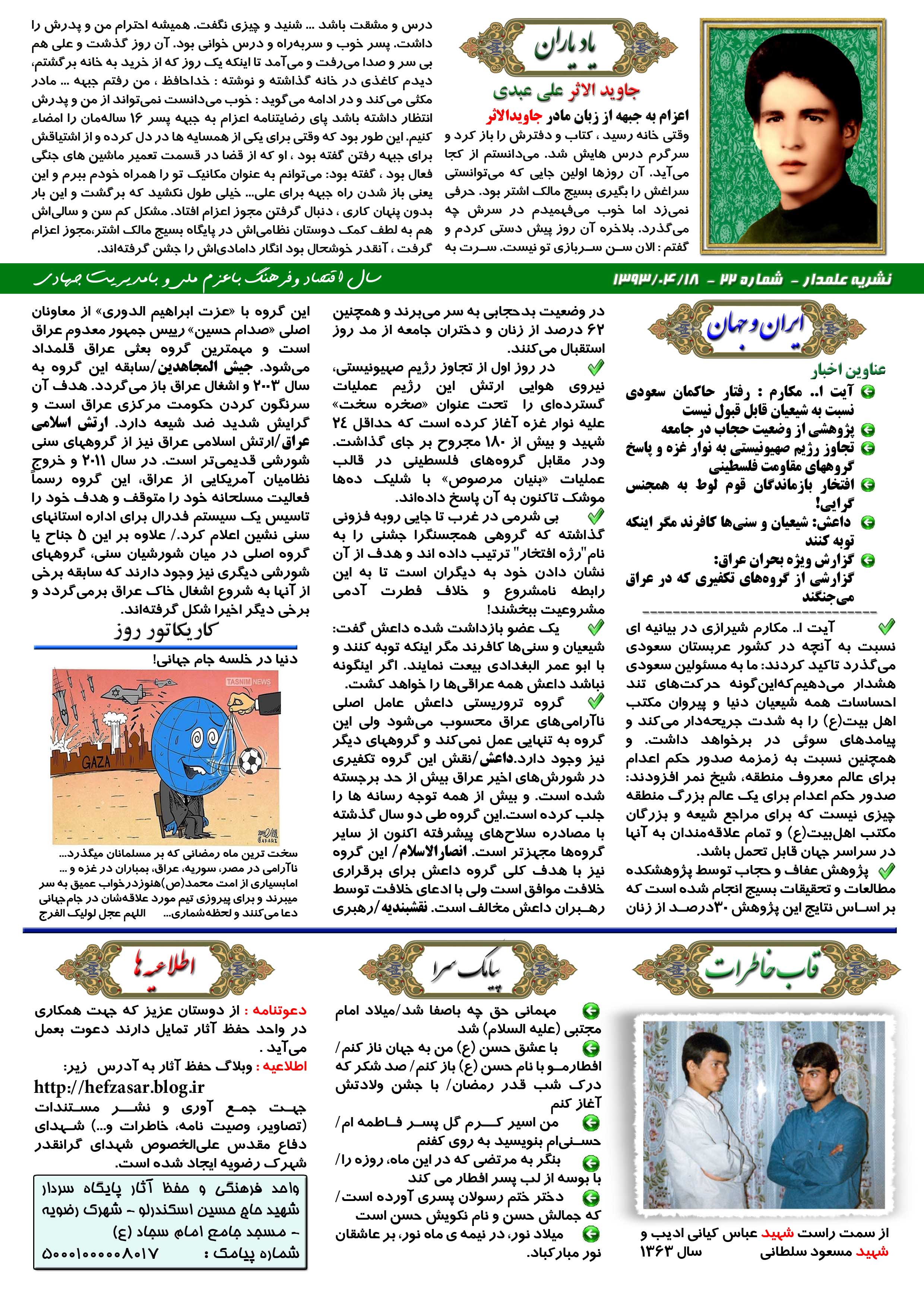 نشریه علمدار _ شماره بیست و دو _ چهارشنبه 18 تیر 1393