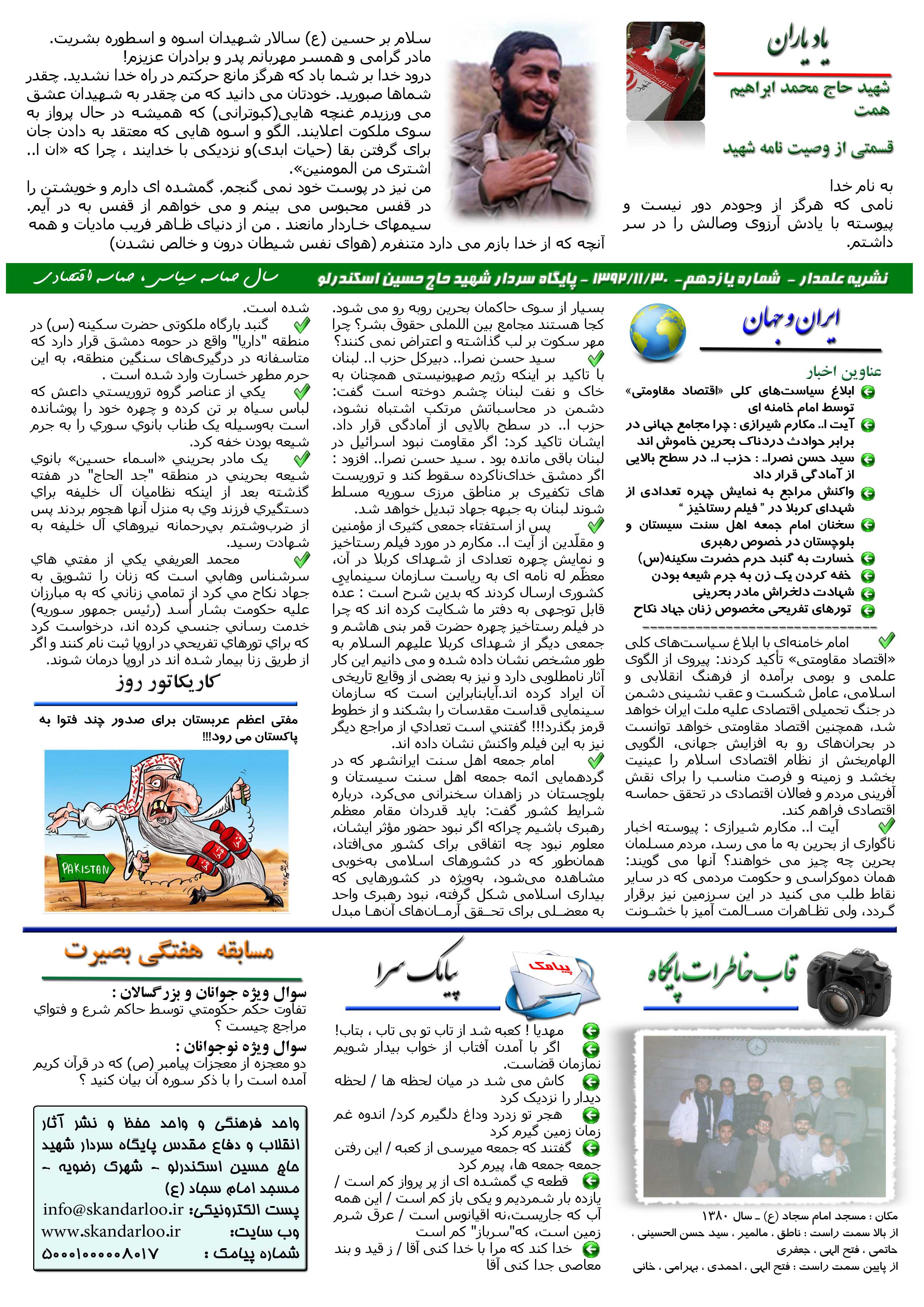 * سید حسن نصرا.. دبیرکل حزب ا.. لبنان با تاکید بر اینکه رژیم صهیونیستی همچنان به خاک و نفت لبنان چشم دوخته است گفت: دشمن در محاسباتش مرتکب اشتباه نشود، حزب ا.. در سطح بالایی از آمادگی قرار داد. ایشان تاکید کرد: اگر مقاومت نبود اسرائیل در لبنان باقی مانده بود . سید حسن نصرا.. افزود : اگر دمشق خدایناکرده سقوط کند و تروریست های تکفیری بر مناطق مرزی سوریه مسلط شوند لبنان به جبهه جهاد تبدیل خواهد شد.