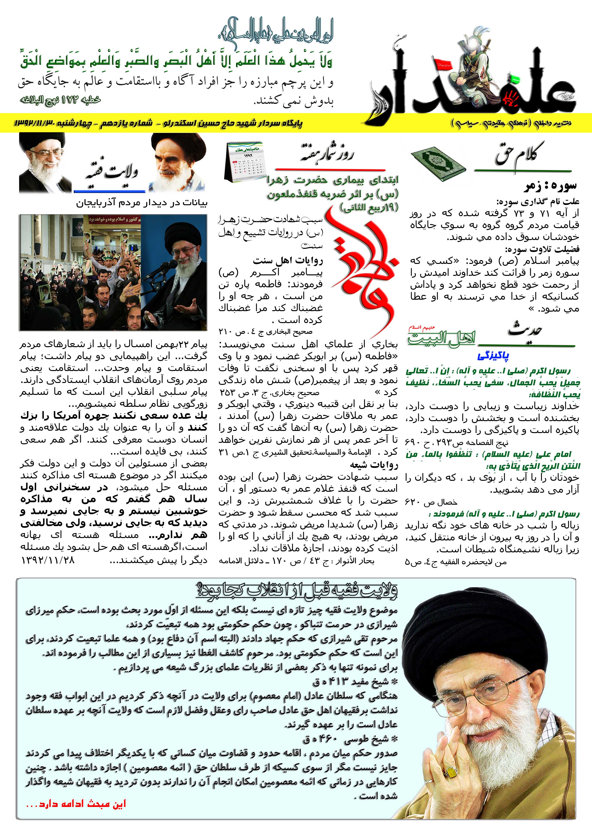 * امام جمعه اهل سنت ایرانشهر که در گردهمایی ائمه جمعه اهل سنت سیستان و بلوچستان در زاهدان سخنرانی میکرد، درباره شرایط کشور گفت: باید قدردان مقام معظم رهبری باشیم چراکه اگر نبود حضور مؤثر ایشان، معلوم نبود چه اتفاقی برای کشور میافتاد، همانطور که در کشورهای اسلامی بهخوبی مشاهده میشود، بهویژه در کشورهایی که بیداری اسلامی شکل گرفته، نبود رهبری واحد به معضــلی برای تحــقق آرمــانهای آنهـا مبدل شده است.