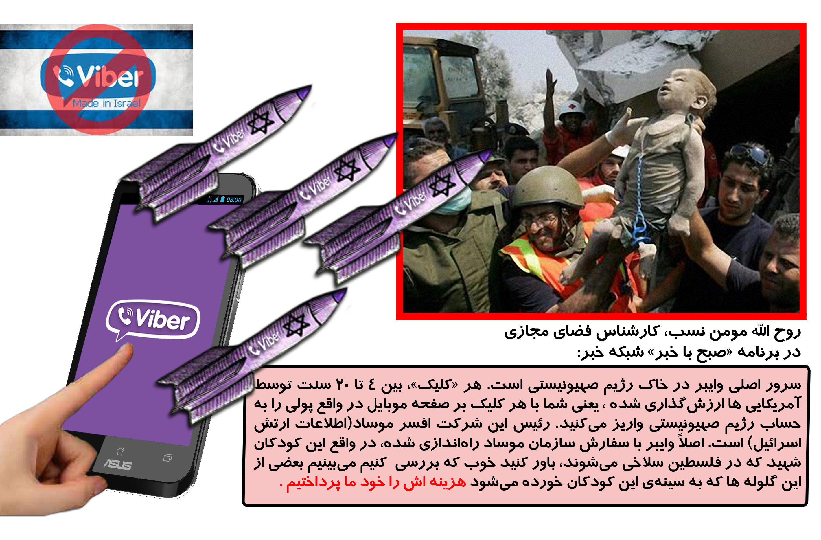 سرور اصلی وایبر در خاک رژیم صهیونیستی است. هر «کلیک»، بین 4 تا 20 سنت توسط آمریکایی ها ارزشگذاری شده ، یعنی شما با هر کلیک بر صفحه موبایل در واقع پولی را به حساب رژیم صهیونیستی واریز میکنید. رئیس این شرکت افسر موساد(اطلاعات ارتش اسرائیل) است. اصلاً وایبر با سفارش سازمان موساد راهاندازی شده، در واقع این کودکان شهید که در فلسطین سلاخی میشوند، باور کنید خوب که بررسی کنیم میبینیم بعضی از این گلوله ها که به سینهی این کودکان خورده میشود هزینه اش را خود ما پرداختیم .