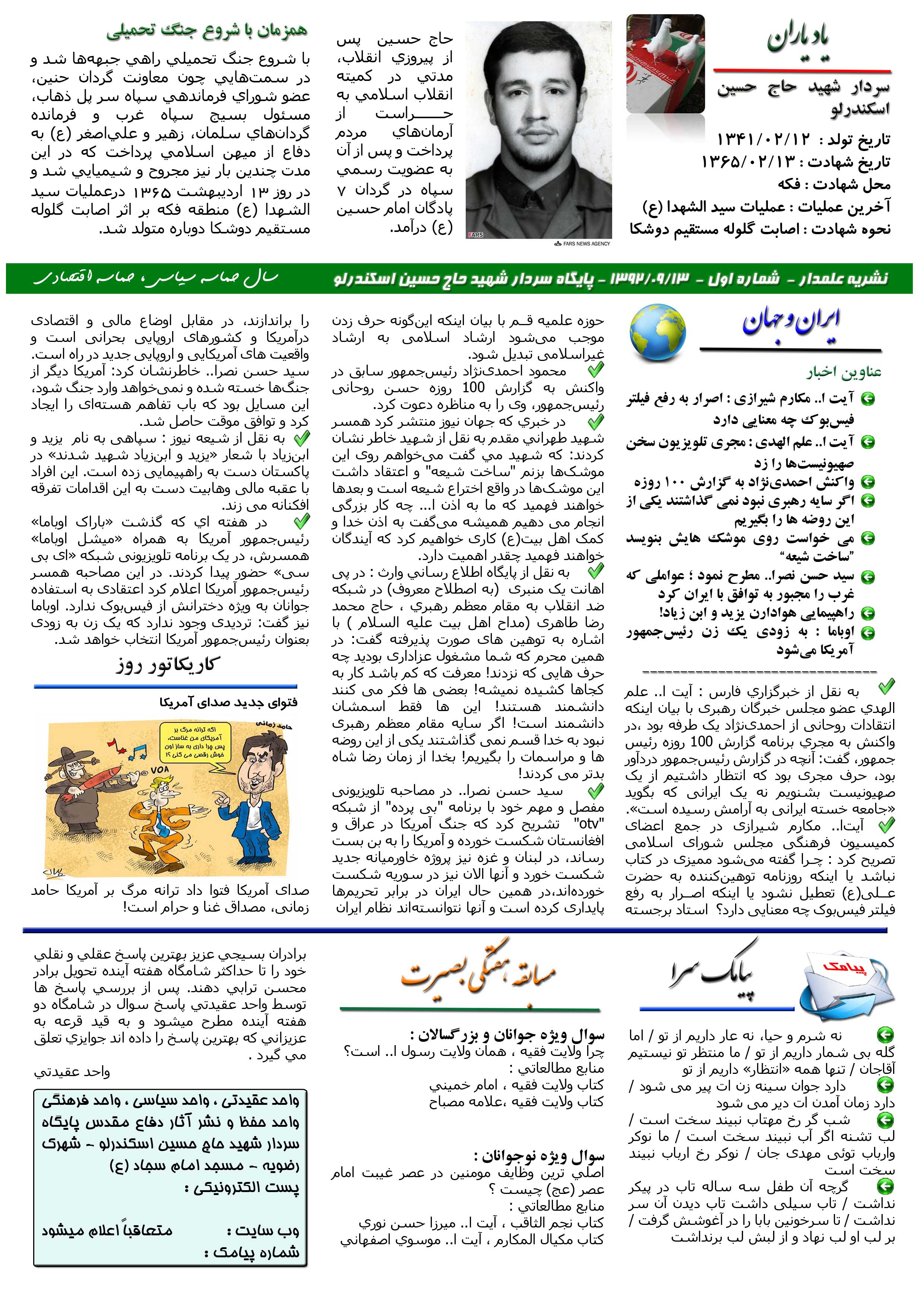 نشریه علـمدار _ شماره اول _ چهارشنبه 13 آذر 1392